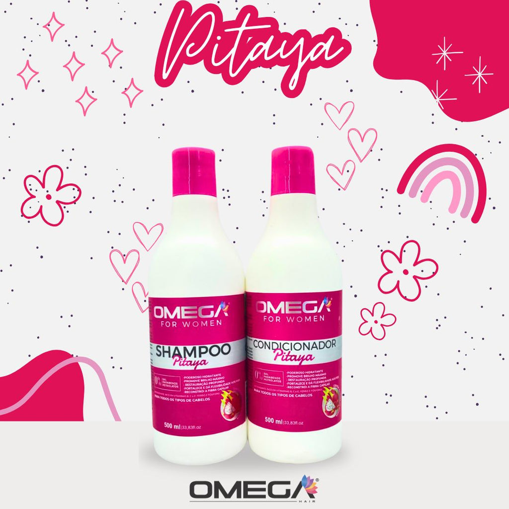 Revitalize seus cabelos com o Kit Pitaya Omega Hair, que combina a limpeza suave do shampoo, o condicionamento profundo para deixar seus cabelos saudáveis, macios e cheios de brilho.