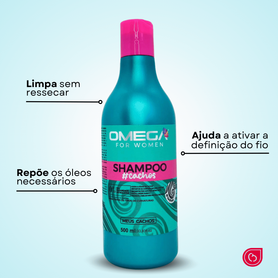 O Shampoo Cachos Omega Hair foi desenvolvido especialmente para cabelos ondulados, cacheados e crespos, proporcionando limpeza equilibrada sem ressecar os fios .